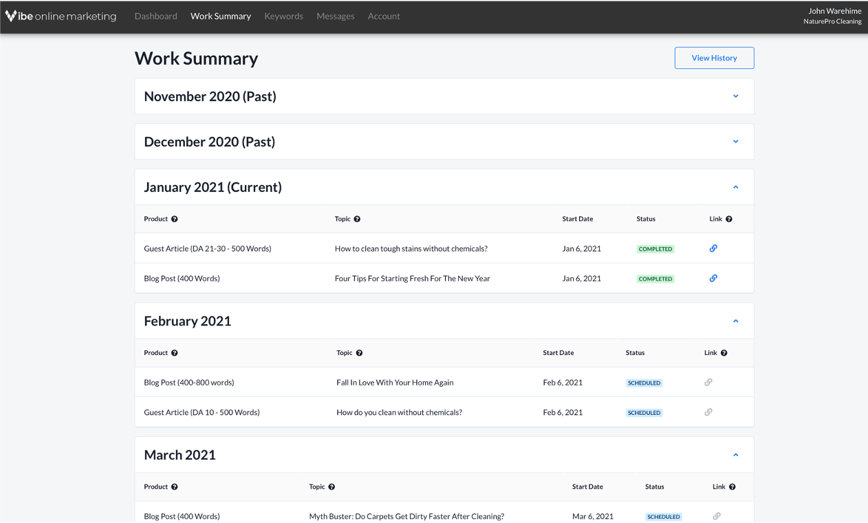 We provide total transparency into all of the work that we perform. Each client is given access to a custom reporting dashboard that shows every single SEO action being performed both on and off their website.